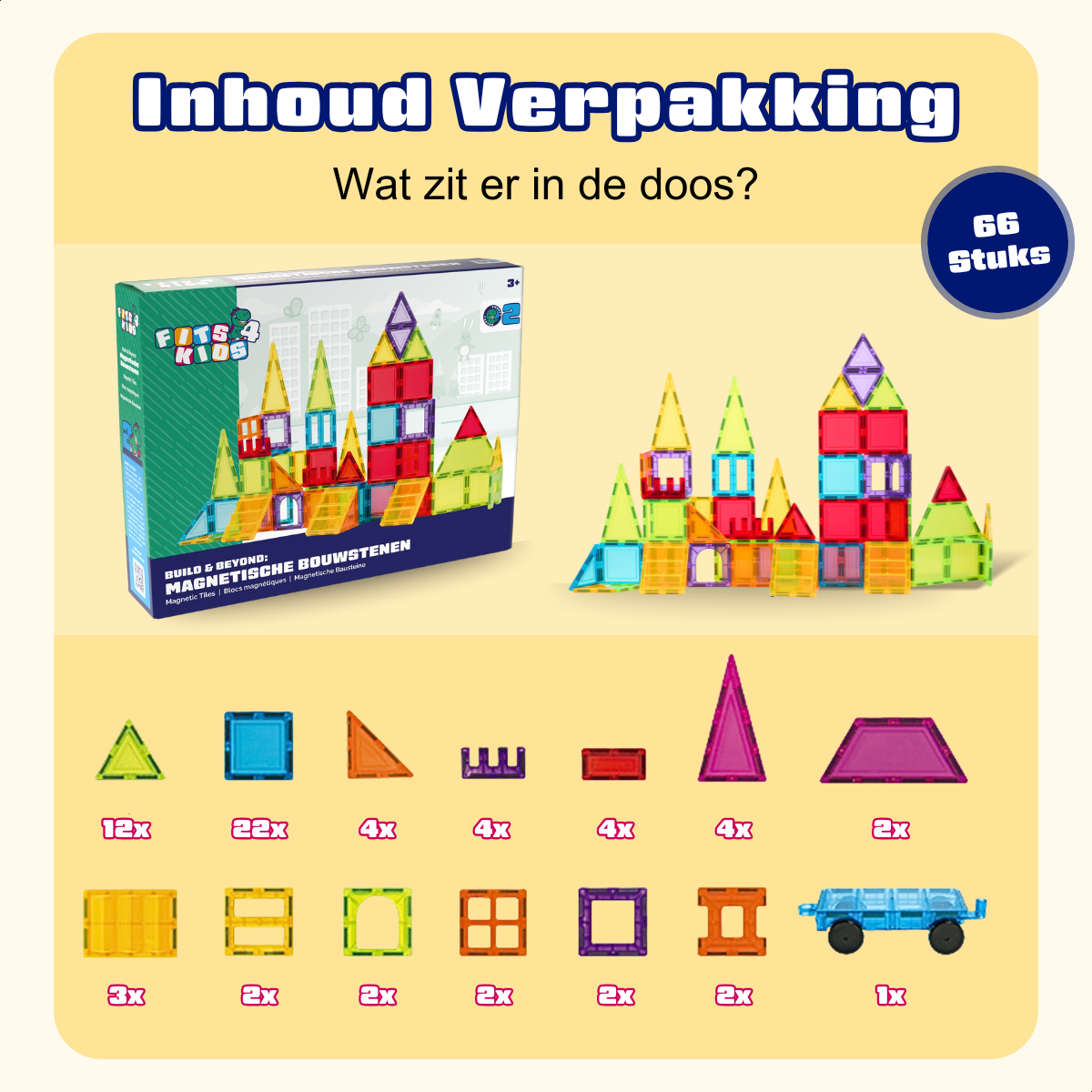 Mit Fits4Kids® Build & Beyond können Kinder grenzenlos bauen, entdecken und kreativ sein. Das 66-teilige Set besteht aus Magnetbausteinen in verschiedenen Formen und Farben. Dieses Magnetspielzeug fördert Fantasie und technisches Verständnis. Die robusten Bausteine ​​mit abgerundeten Ecken lassen sich sicher und einfach zusammenklicken. Unsere Bausteine ​​sind mit denen anderer beliebter Marken kompatibel und bieten dieselbe hohe Qualität – ideal zum Erweitern und Kombinieren.